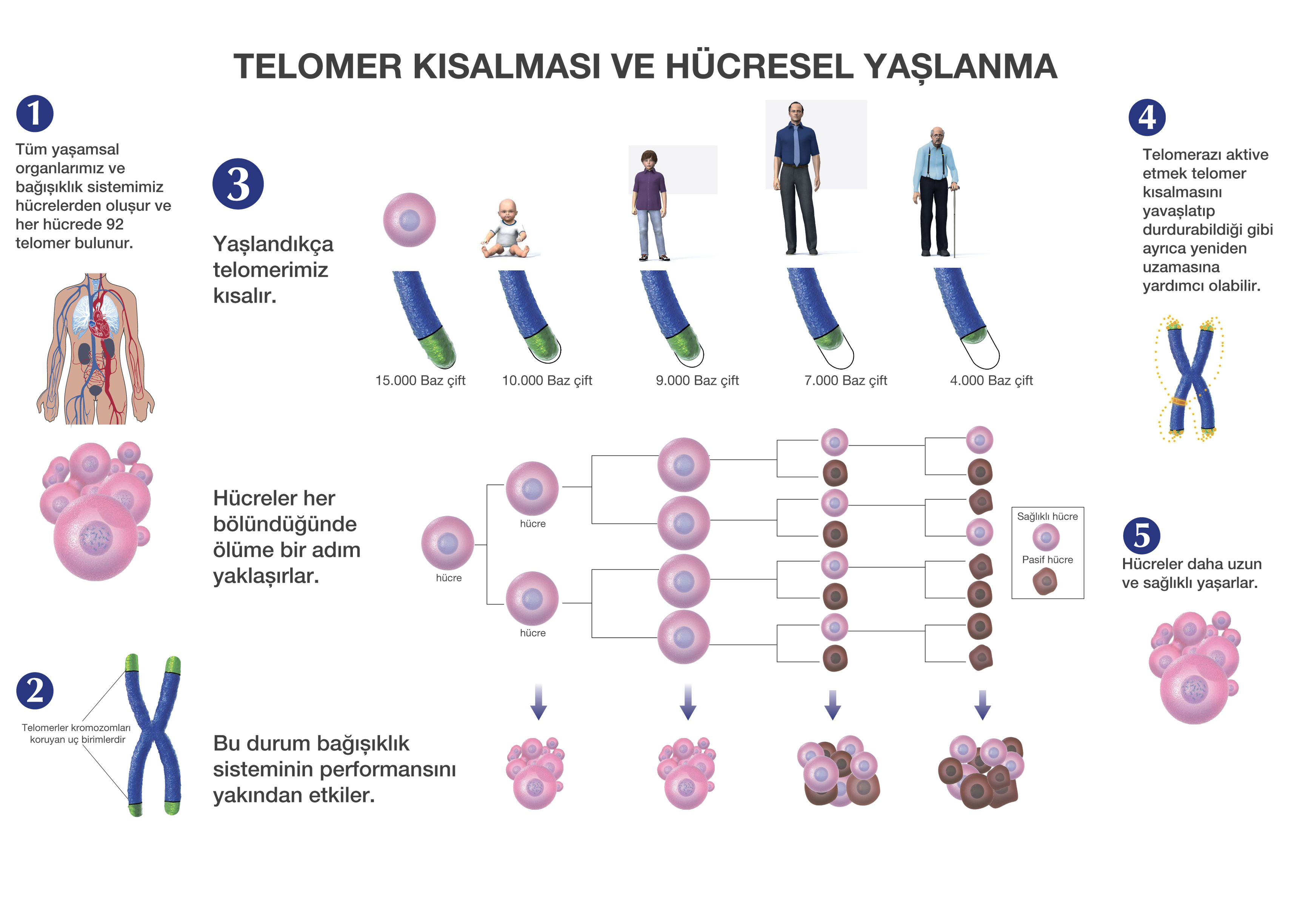 Genellikle yaşlandığımızda telomer uzunluğumuz 3.000-4.000 BP ’ye kadar kısaldığında artık hücrelerimiz görev yapmayı bırakırlar. Tüm yaşamımız boyunca yaklaşık her biri 7.000 BP uzunluğunda telomerimiz vardır ve her yıl yaşam şekline bağlı olarak 50-200 BP/yıl kısalır.