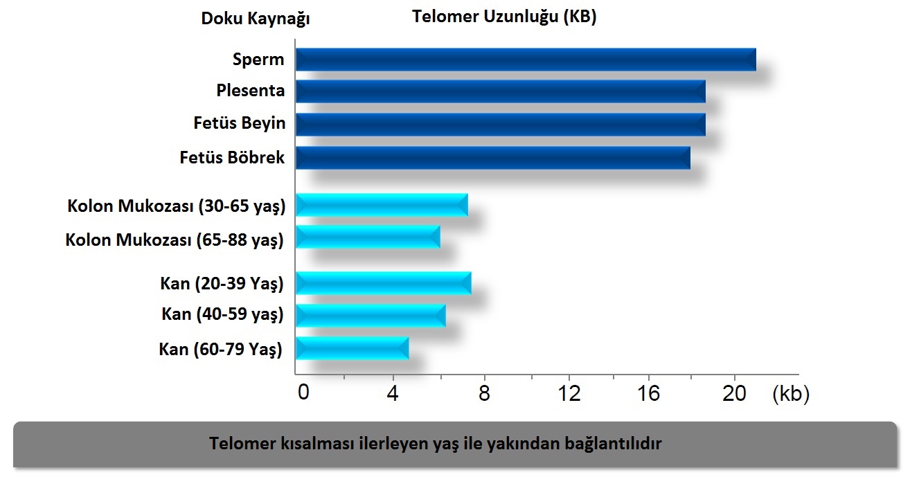 Embriyonun ilk başlangıçta telomer uzunluğu 15.000 BP (base pair-baz çift) olarak başlar. Anne rahminde o kadar hızlı bir hücre bölünmesi ve çoğalması yaşanır ki bebek doğduğunda telomer uzunluğu 10.000 BP’ye kadar düşmüştür.